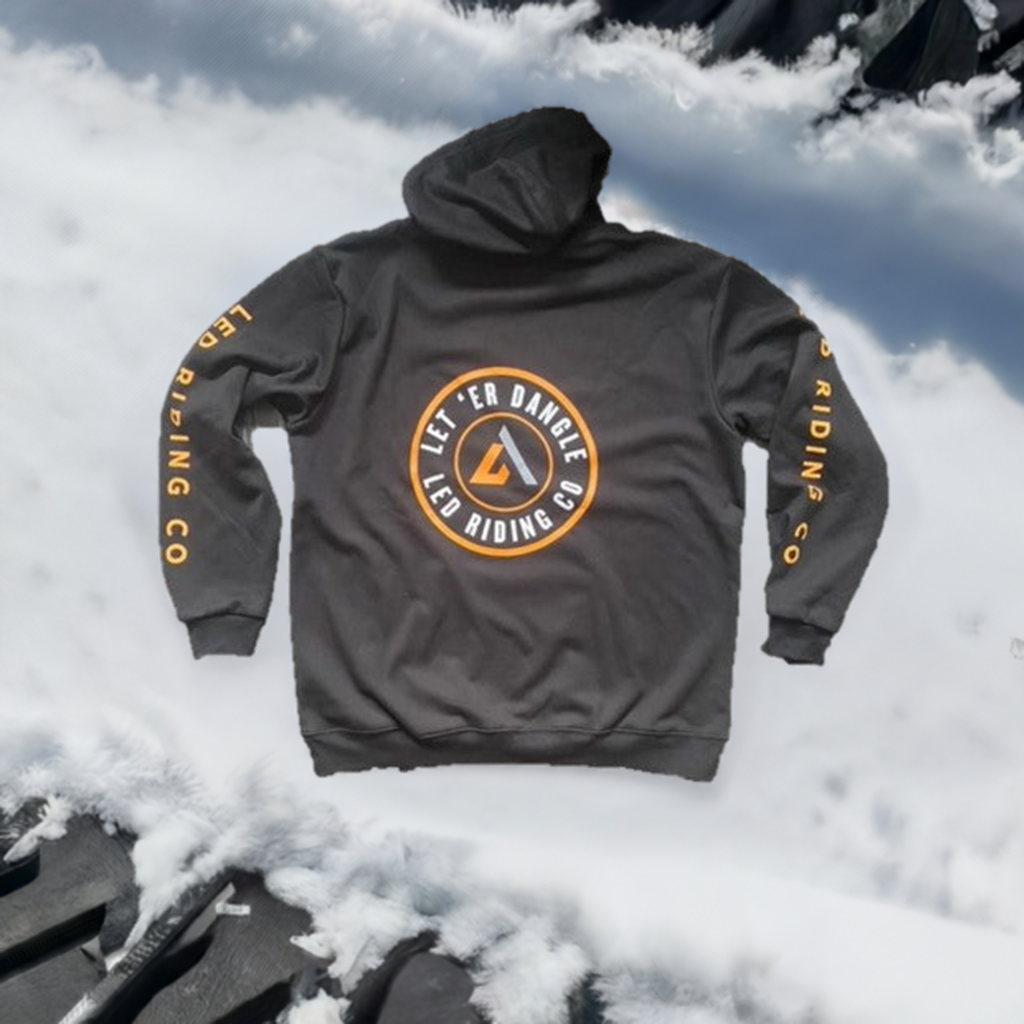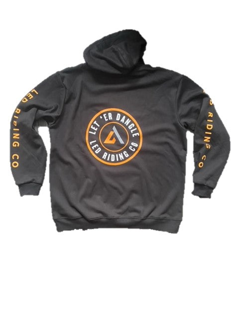 Black hoody with orange crest and orange LED writing down the sleeves and the let er dangle crest on the back perfect for guys and girls!