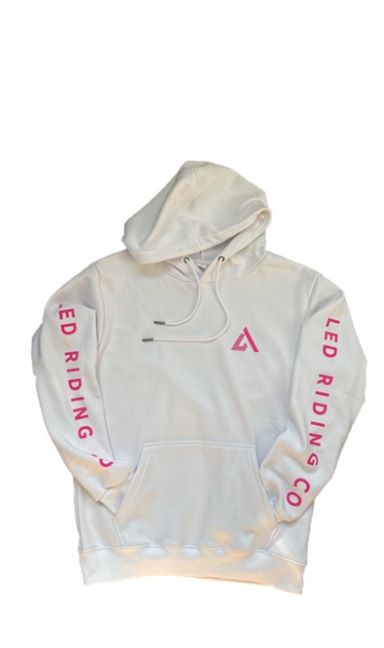 The original LED dangle hoody in bright white with hot pink writing, stand out in the crowd!